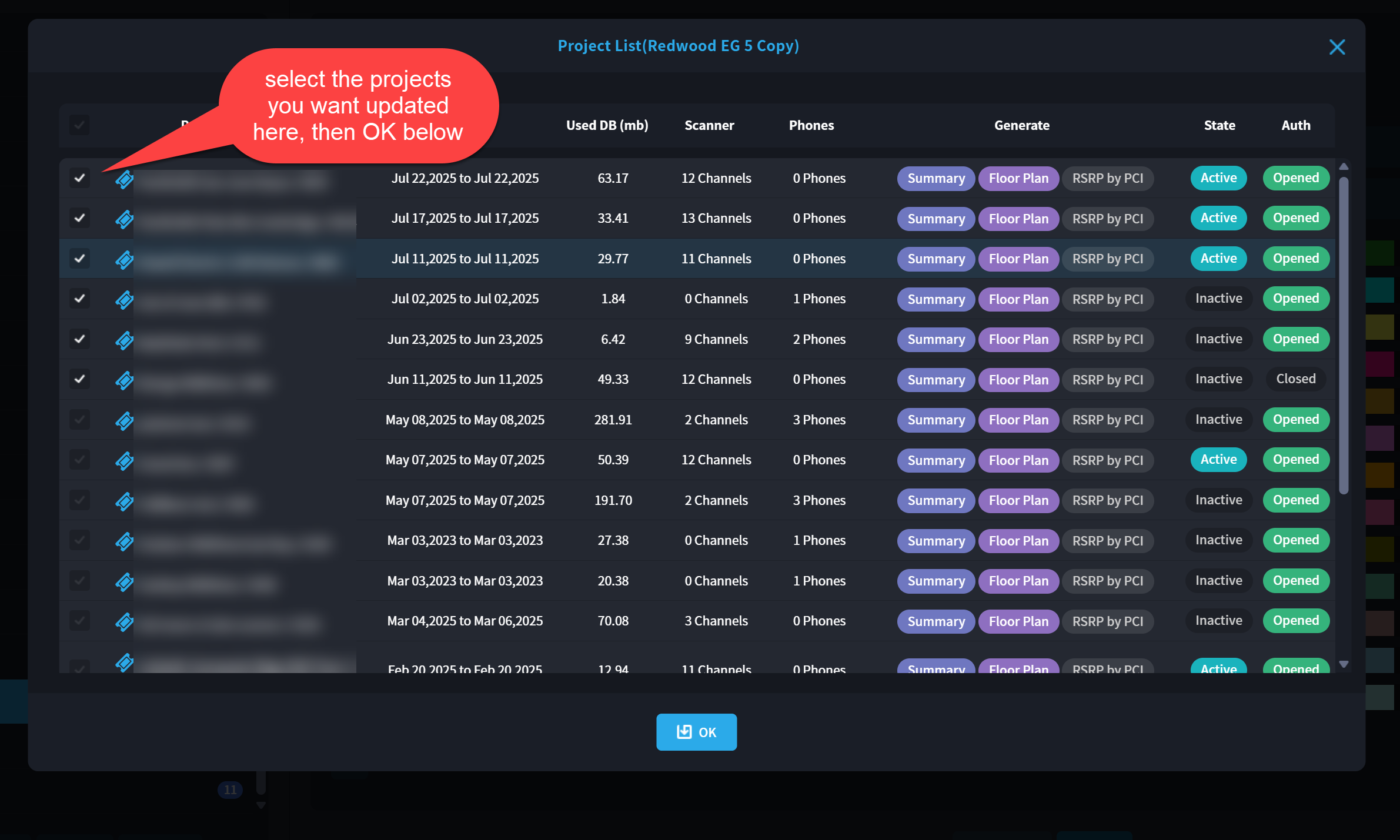 choose the legend by applying the checkbox to the left, then "Apply". A new dialog will show the entire list of 17 projects that have this legend assigned. Choose the specific project(s) you want to update and choose OK.